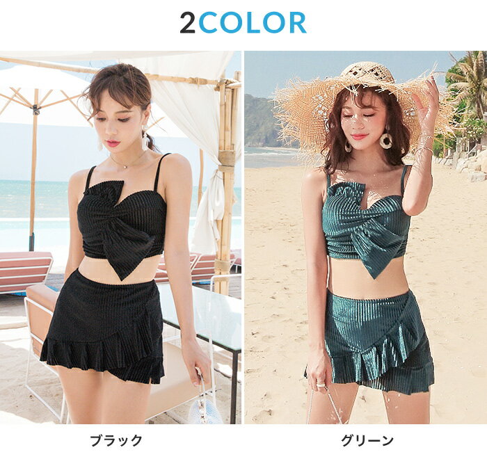 ビキニ 黒 水着 ビスチェ バンドゥ リボンビキニ レディース 体型カバー リボン水着 ショートパンツ 一体型スカート グリーン ブラック かわいい セパレート オトナ可愛い mizugi 通販 bikini ママ ミセス 9号 11号 13号